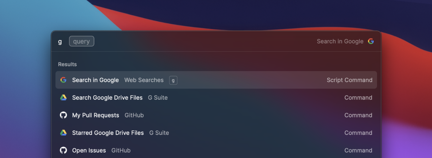 If you define an alias for your Script Command, you can type the alias, followed by a space to select the first required argument. This allows to rapidly search for something on Amazon — just type "am {your query}".