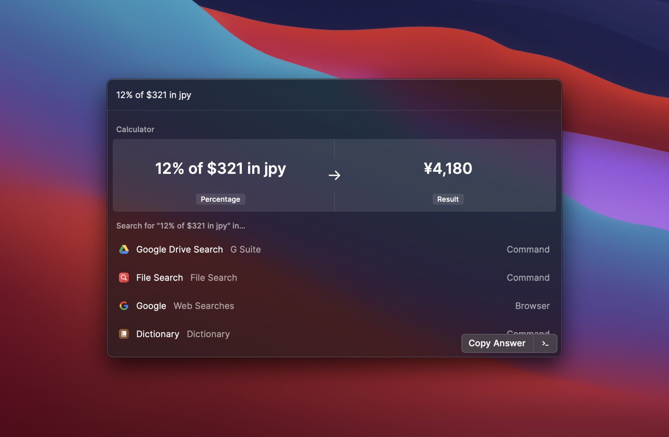 Simply type an expression to solve complex math equations or convert time zones, units, and dates. Copy the answer to your clipboard to carry on with what you were doing before.