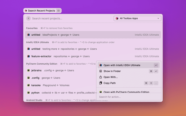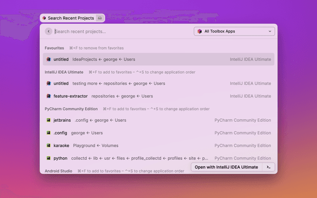 JetBrains Toolbox Search Recent Projects