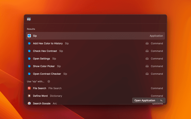 Access these Sip color management app features directly from Raycast: