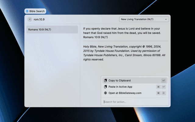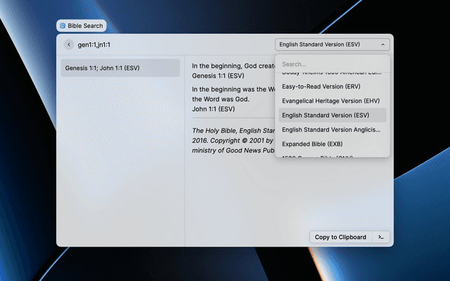Search for, display, copy and paste bible passages. Configure whether to include verse numbers or show one verse per line.