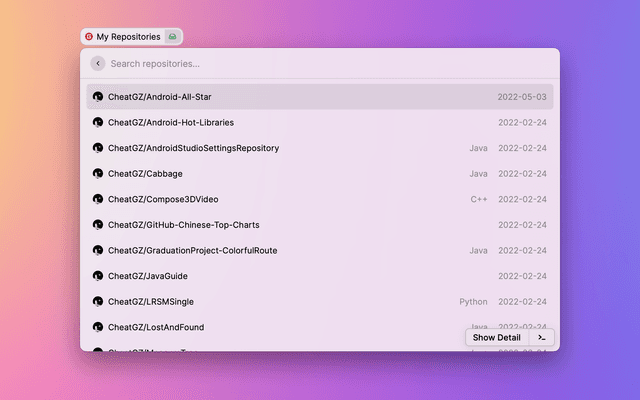 Search repositories on GitHub and open previously visited ones faster.
