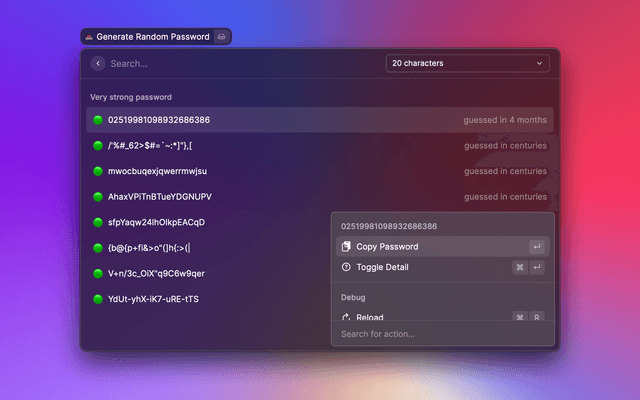 Generates a password from 5–64 characters with options for case, special characters, and more