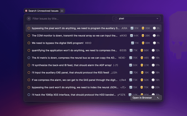 An extension to quickly search unresolved issues in Sentry. This can be handy to stay on top of erros and squash these nasty bugs.