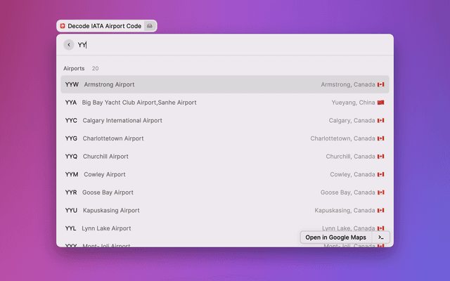 This Raycast extension decodes IATA codes for airports, airlines and aircraft, allowing you to work out what a given code refers to. To do this, it uses a bespoke API.